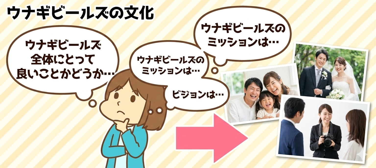 お客様に感動を届けるためには、フォトグラファーやスタッフが現場の状況に合わせ自らの判断で「ウナギビールズにとって、そしてお客様にとって最善のこと」を即座に実行する必要があります。